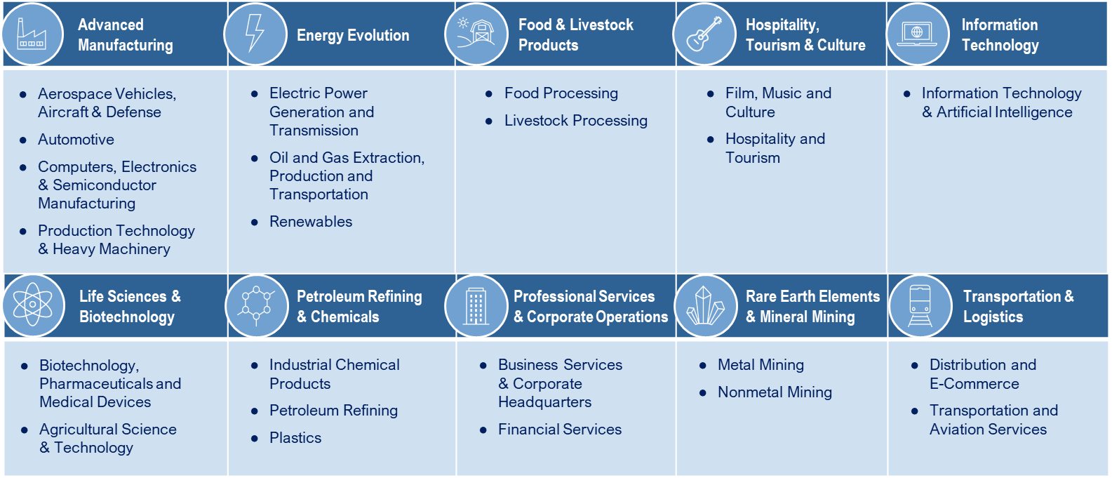The Hospitality, Tourism and Culture sector is focused on the provision of services and experiences to entertain and accommodate Texans and visitors alike. This sector is built upon Texas’ rich diversity of experiences, events and geographies. Within the Hospitality, Tourism and Culture sector, the state has identified two target clusters: Film, Music and Culture; and Hospitality and Tourism.